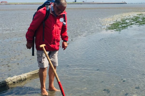 In einer größeren Gruppe geht‘s vom Treffpunkt an der Familienlagune bei schönstem Wetter in die Wunderwelt Wattenmeer. Schuhe aus und losgelaufen! Wattführer Bodo Spreu weiß auch gleich zu erklären, dass der Körper übers Barfußlaufen im Schlick entsäuert. Wir haben das Gefühl, das weite Meer einzuatmen – so frisch schmeckt die salzfeuchte, jodhaltige Luft. Sehr gesund ist sie natürlich auch. Wen wir bei unserem Ausflug ins Watt noch so alles kennengelernt haben, seht selbst!