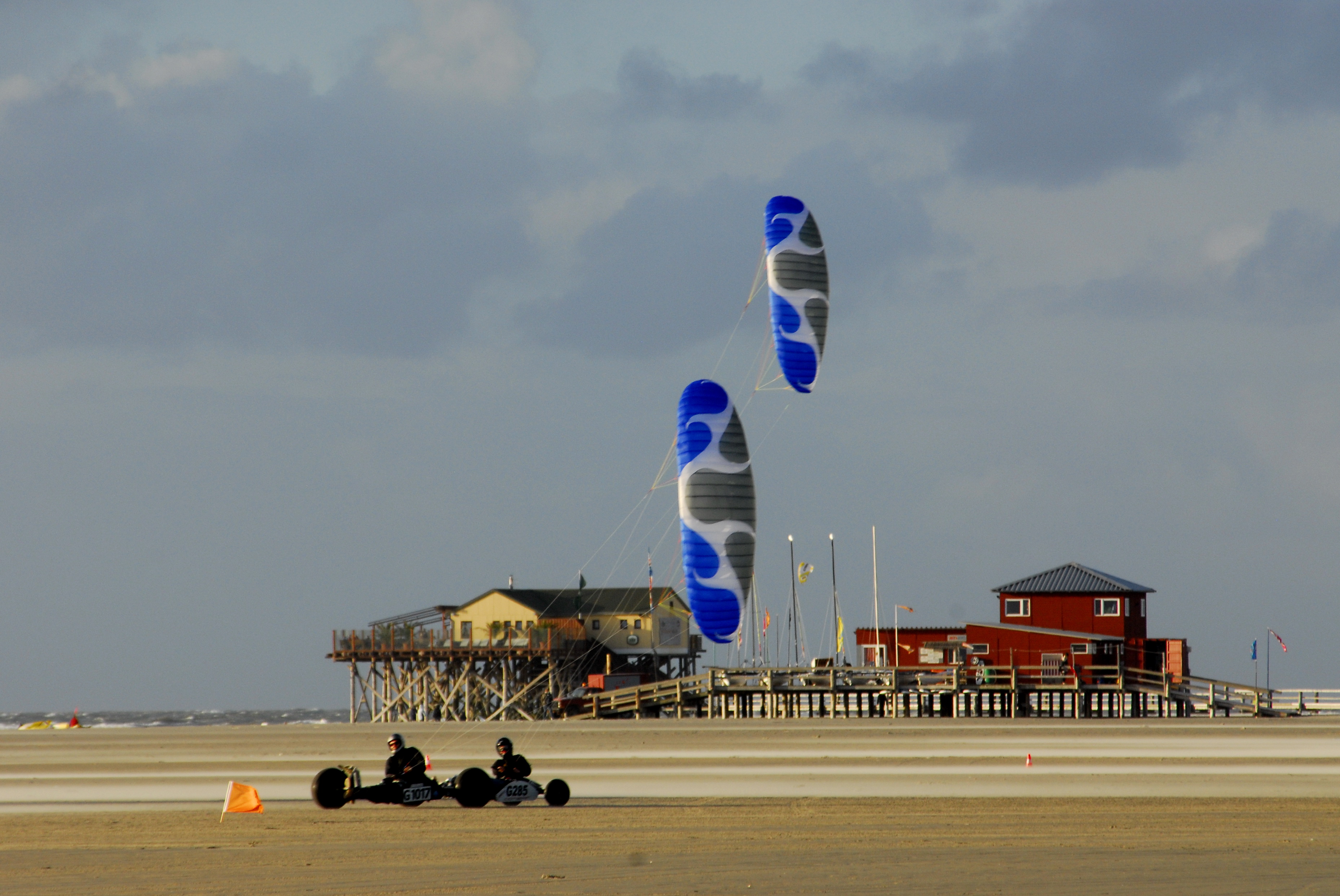 Sonne, Sand und endlose Weite – mit einem Kitebuggy kann man ohne Geknatter und Gebrumm über den idyllischen Strand preschen und das Wattenmeer vor St. Peter-Ording durchqueren. Lautlos und schnell bewegen sich die kleinen Fahrzeuge der Buggyfahrschule durch die einzigartige Landschaft, angetrieben von einer gewaltigen Naturkraft – dem Wind. Für viele Kitebuggyfahrer ist das weitaus mehr als nur Sport. Nur eine Hand breit über dem Strand zu fahren, ist vielmehr ein Naturerlebnis – und ein Riesenspaß. Auf der großen Sandbank in SPO sind die Bedingungen für das Kitebuggyfahren optimal. Selbst als Einsteiger ohne Vorkenntnisse kann man den Sport hier in der Buggyfahrschule unter fachkundiger Anleitung erlernen. Es werden auch Schnupper-Intensiv-Kurse sowie Kite-Events angeboten.